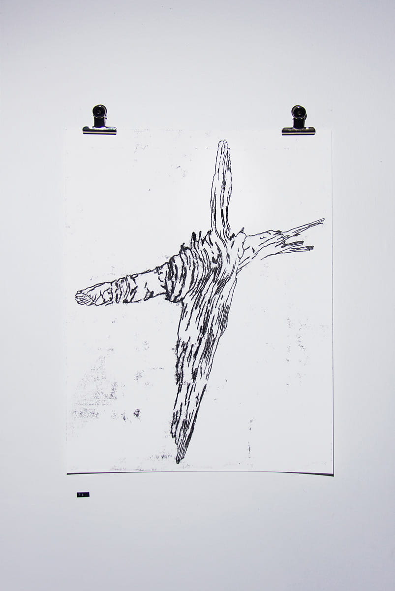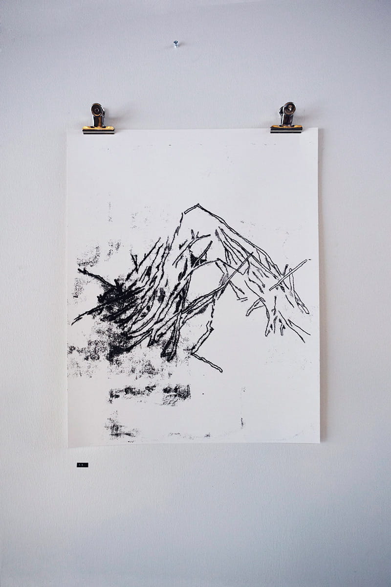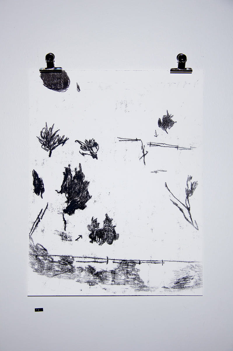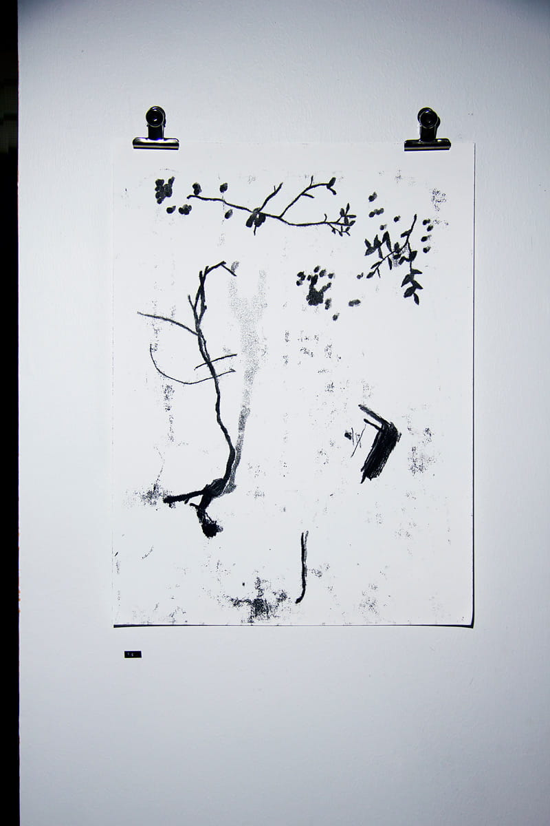 Series of four monotype prints called Änäkänselän asutuksen jäänteitä I-IV (Remainings of Änäkänselkä habitation I-IV), all 59,4 × 84,1 cm. I thought of finding signs of first native settlements around my summer cabin woods. These were seen in the Exhibition no. 2 of our since defunct co-operative group called Cornershop.
