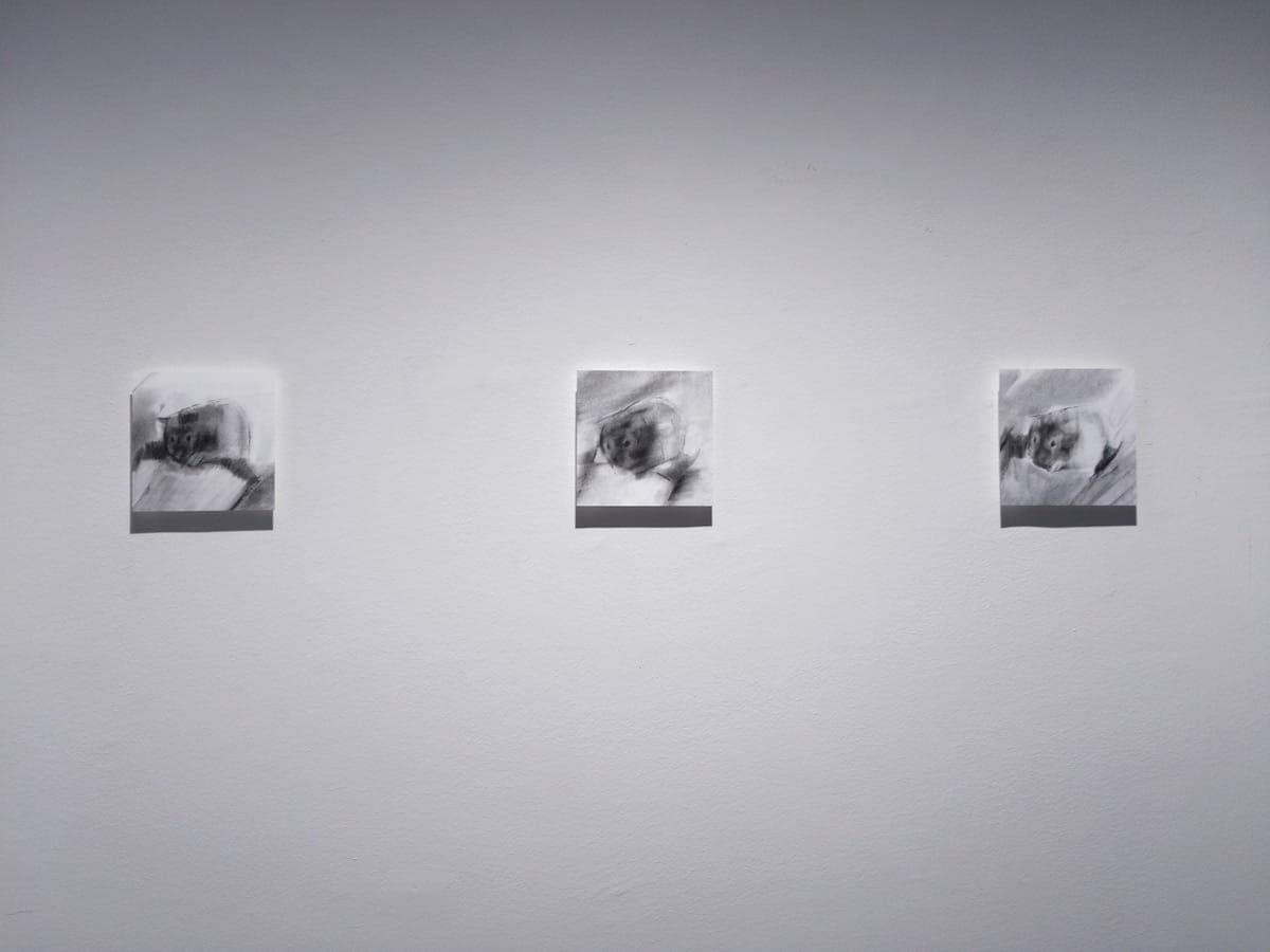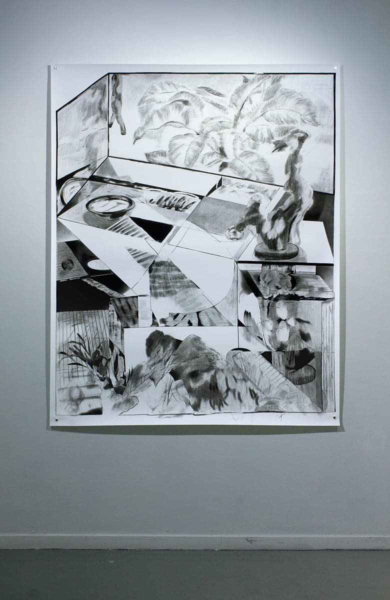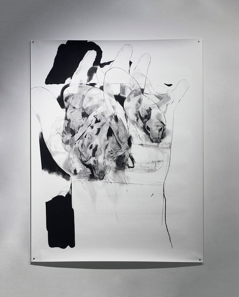 My charcoal drawings and installation base on the interest towards our relation to other species and the habit of building nature-like environments for us and to those others. How natural materials are seamlessly combined with plastic, metal and glass. Slippery and hard surfaces in which claws rustle and teeth sink into slower. Amidst these themes I’ve tried to shatter my ways of crafting images and tolerate the imperfectness of drawing.